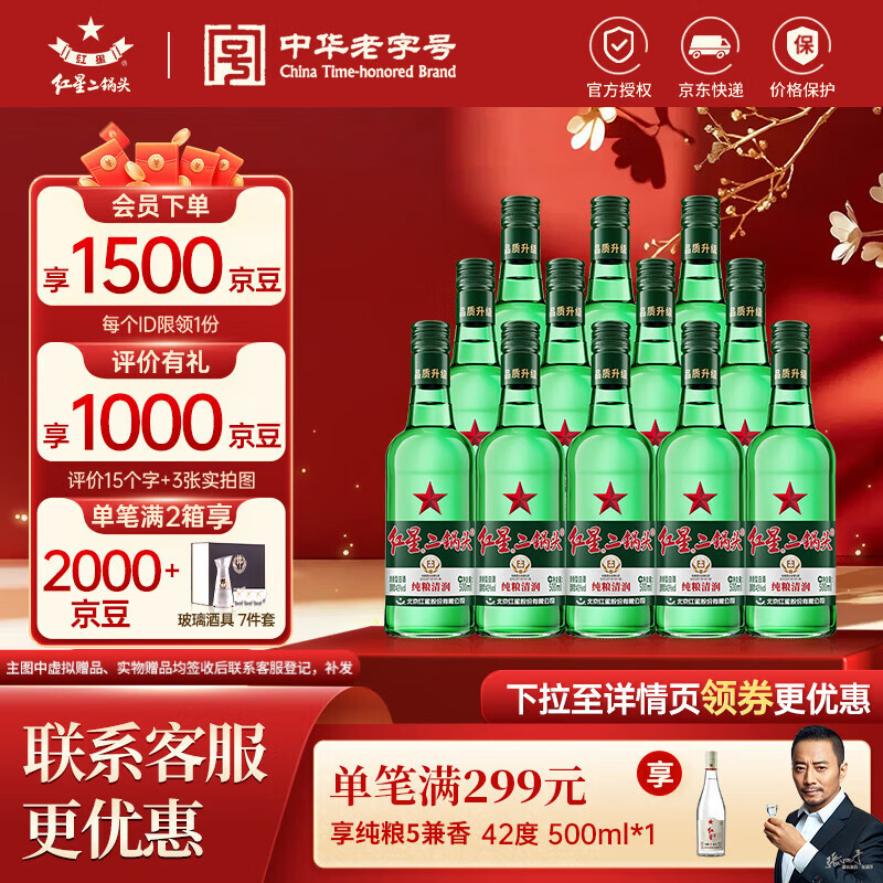 红星二锅头 绿瓶大二 纯粮升级甜润清香型白酒 自饮北京特产节日礼品 43度 500mL 12瓶 整箱装