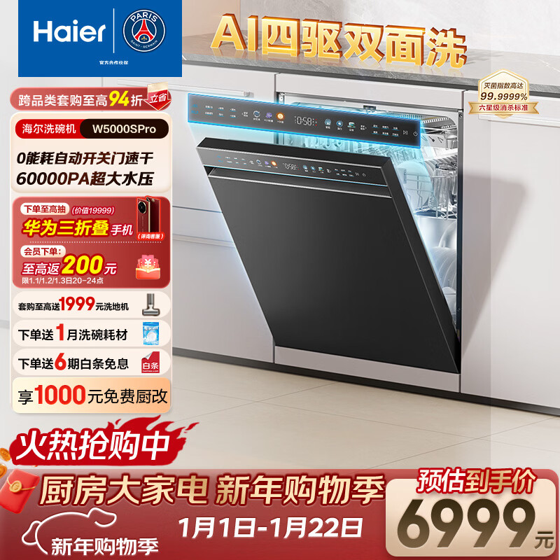 海尔(Haier)【四驱双面洗W5000SPro】洗碗机嵌入式18套大容量智能开关门UV除菌10天净存EYSZW18586GHU1
