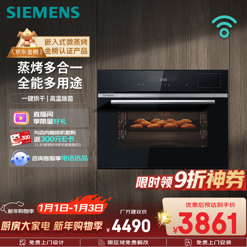 西门子(SIEMENS)【温湿精控】黑魔方四合一蒸烤箱一体机嵌入式58L 蒸烤炸炖 自清洁家用蒸烤箱CS8J4DNB1W