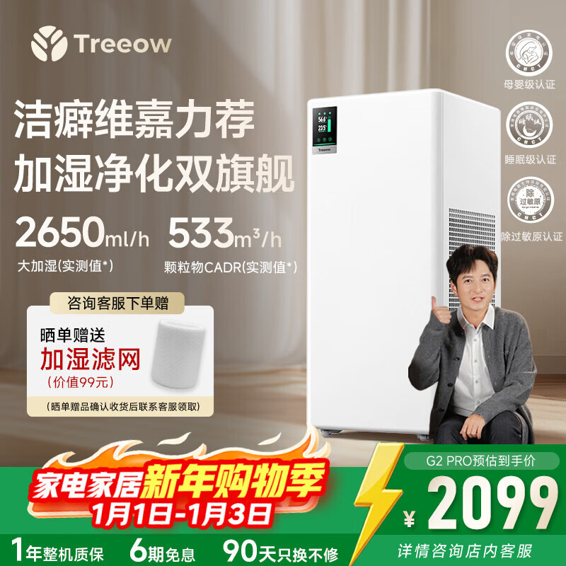 树新风【维嘉同款】加湿净化一体机G2pro卧室除过敏静音空气净化器大加湿量母婴无雾加湿器
