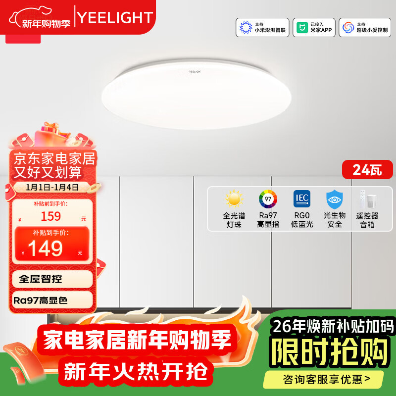 Yeelight易来全光谱护眼吸顶客厅灯卧室智能米家APP歆月C400【包安装】