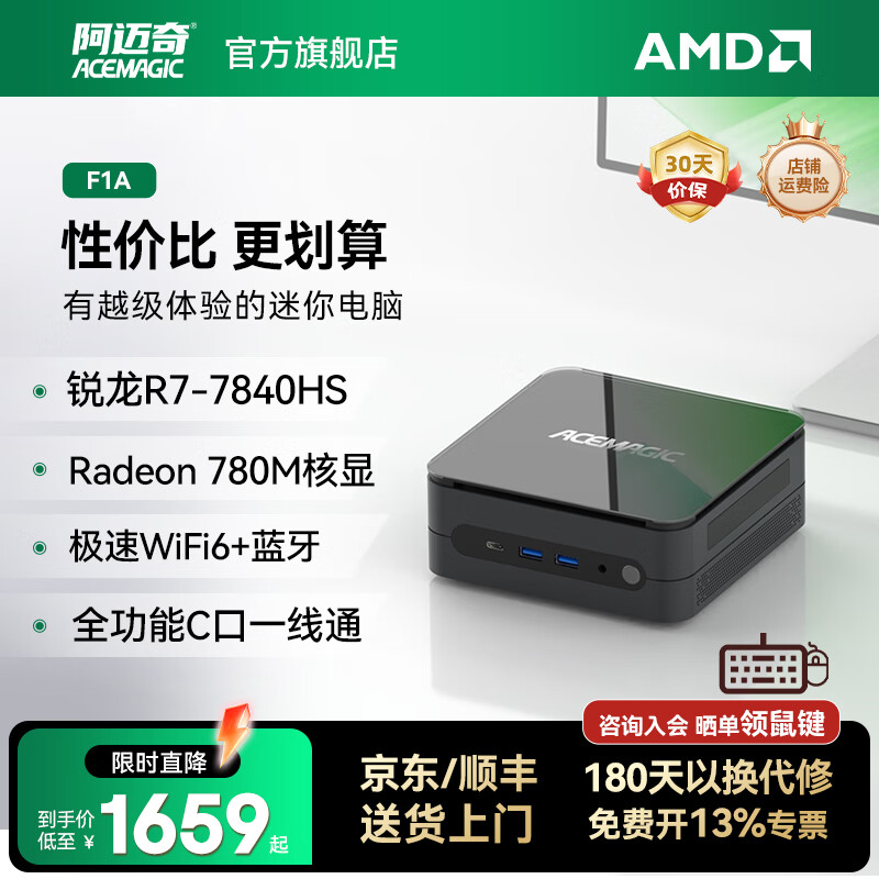 阿迈奇F1A AMD 7840HS高性能独立显卡级游戏电竞i9迷你主机商务办公设计家用台式机整机mini小电脑 锐龙R7-7840HS款 16G+512G