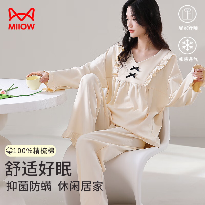 猫人女士睡衣女100%纯棉防螨抑菌甜美套头家居服可外穿米色2XL