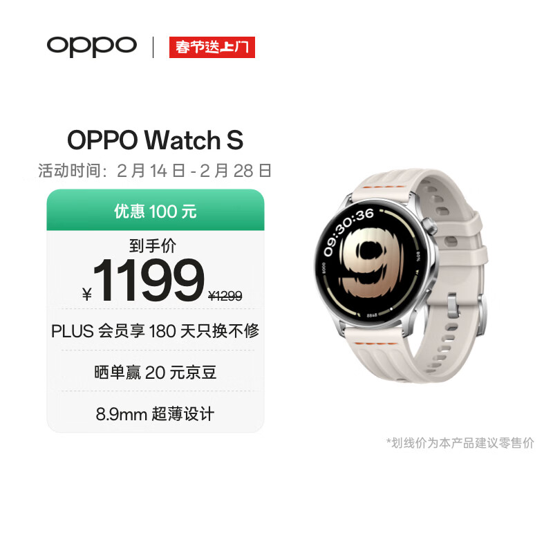 OPPO Watch S 律动银【国家补贴】超薄设计 AI 运动教练 oppo智能手表男女运动手表防水 京东自营