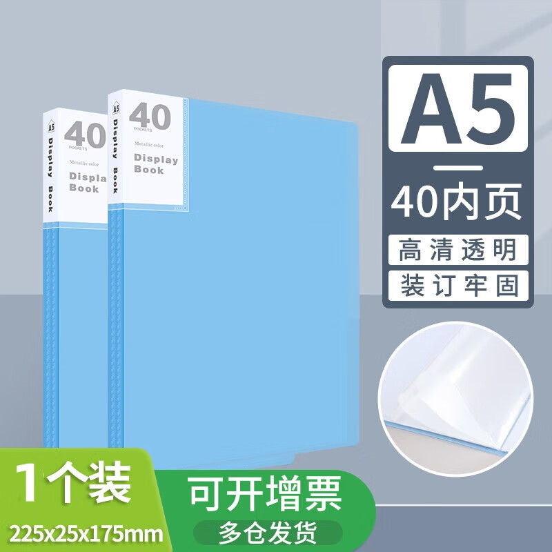 绿文A5蓝色40页小规格资料册5R相片收纳医院检查报告袋学生收纳32K透明文件收纳袋产检翻页资料收纳册 单个装