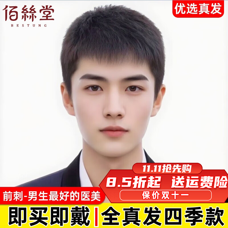 佰丝堂男士假发自然全头套真人发丝男假发套100%全真发假发男生微分碎盖
