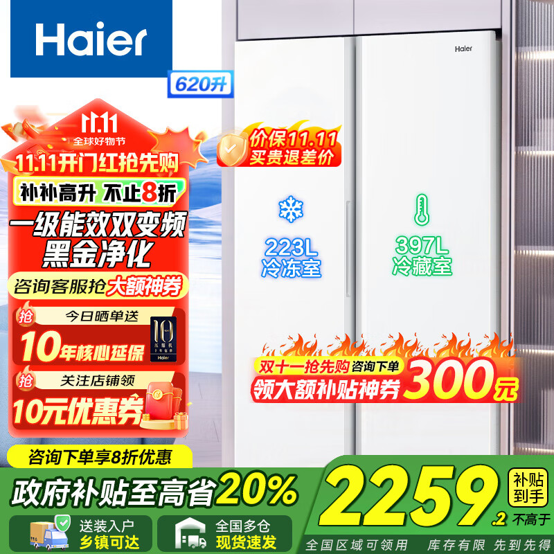 海尔冰箱双开门对开门纤薄一级能效双变频风冷无霜大容量节能保鲜家用冰雪白 国家补贴20%以旧换新 620升大容量+黑金净化+90°开门悬停