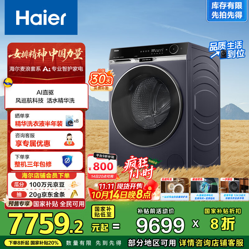海尔(Haier)【麦浪套系】13KG滚筒洗衣机全自动热泵洗烘一体带烘干 家电国家补贴以旧换新 直驱超薄XHG13L98U1