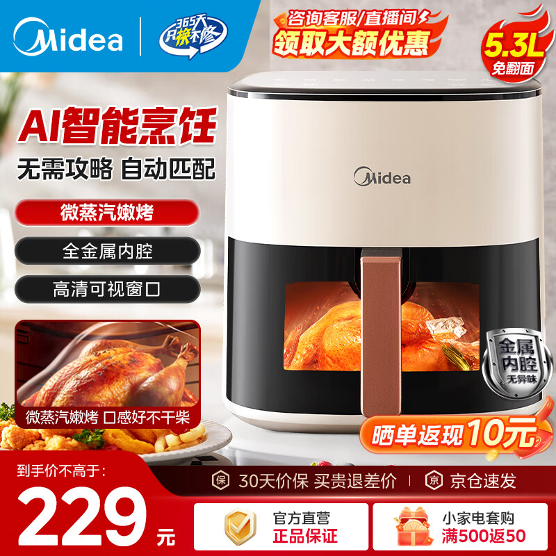 美的(Midea)空气炸锅 家用AI智能烹饪免翻面 全自动微蒸汽嫩烤 可视大视窗 大容量升级金属内腔 5.3L 【智能烹饪】可视免翻面KZC5388