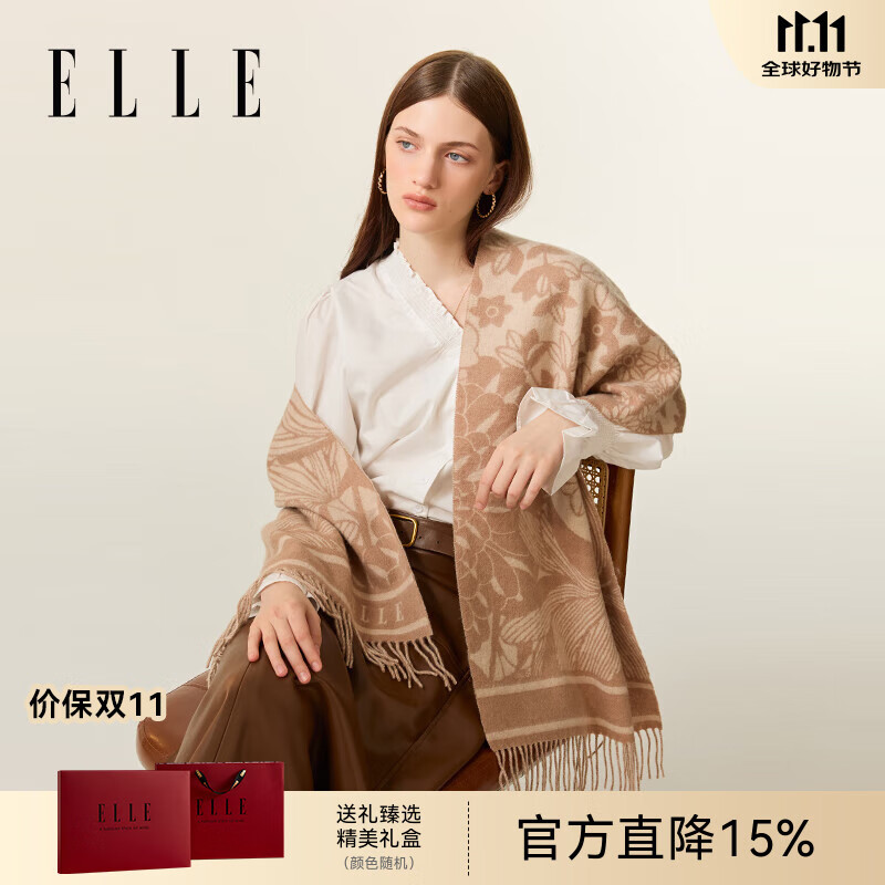 ELLE【礼盒装】100%绵羊毛围巾女秋冬礼物保暖时尚提花围脖披肩