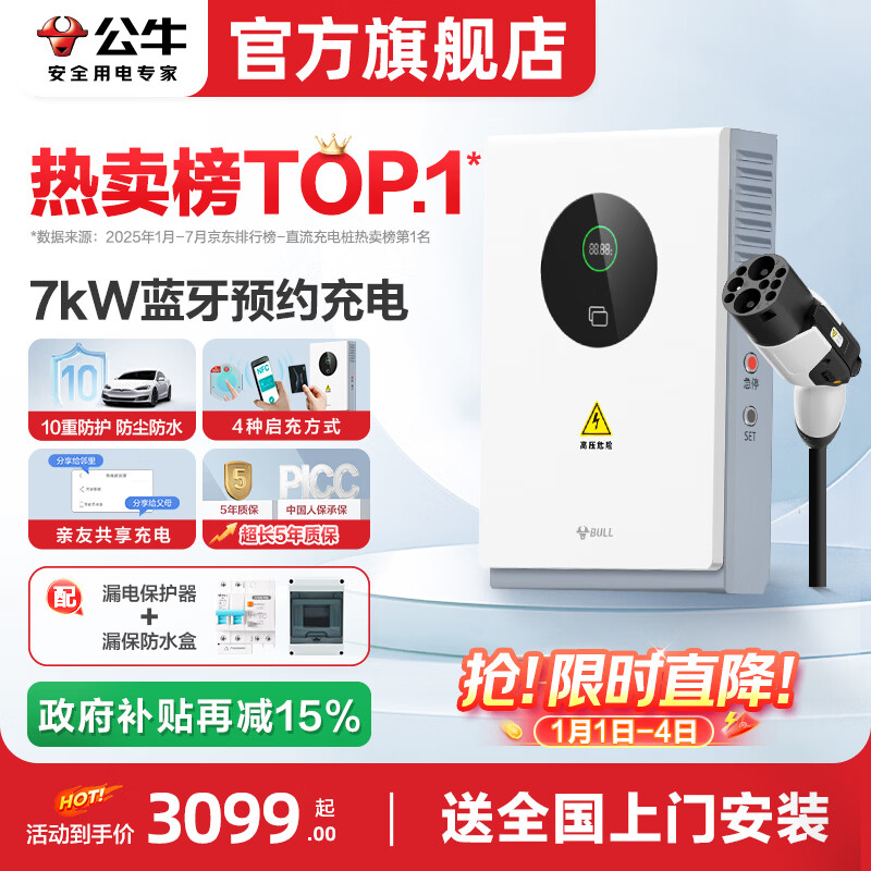 公牛直流充电桩20kw7kw家用快充九孔9孔适配于蔚来红旗eqm5极越理想MEGA特斯拉奥迪理想华为问界极氪 7KW直流-蓝牙预约充电(送基础安装)