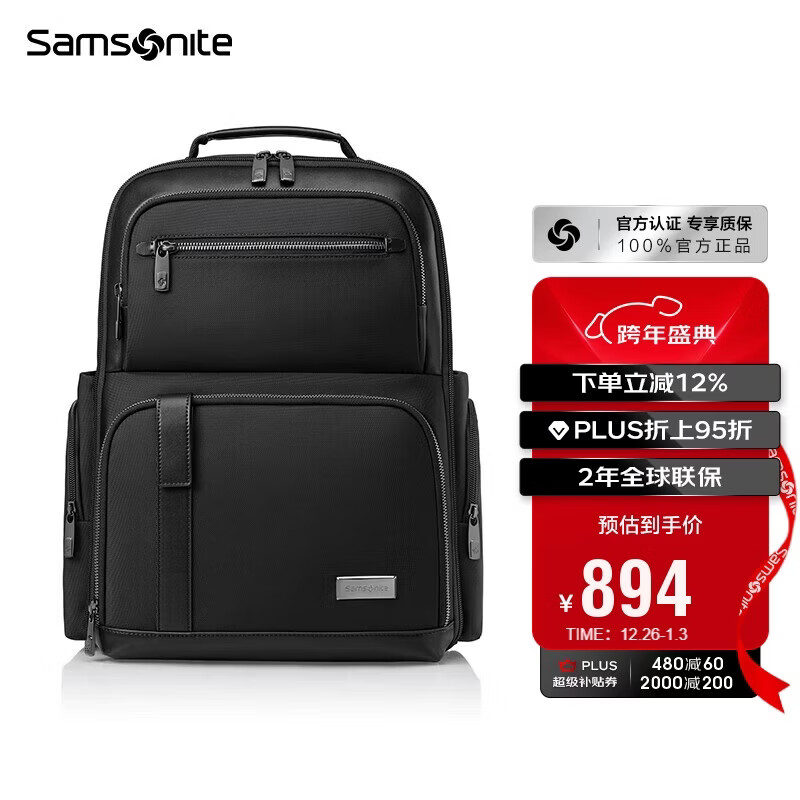 新秀丽(Samsonite)高端商务双肩包电脑包14英寸男士背包短途出差大开口牛皮革NR9