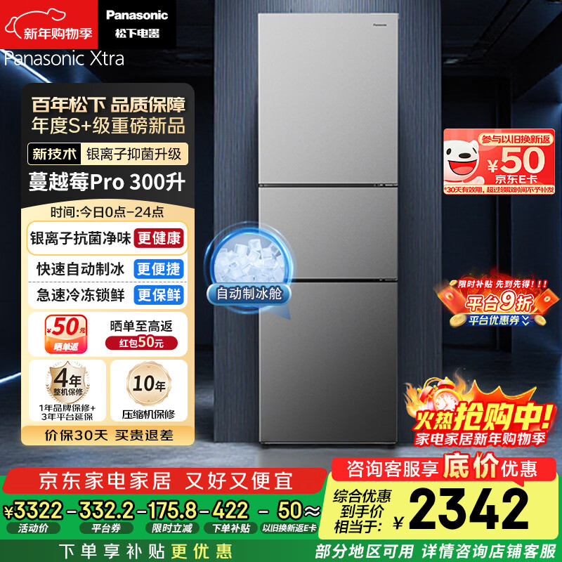 松下(Panasonic)Xtra蔓越莓300L三开门冰箱家用小型超薄自动制冰一级能效风冷无霜NR-XC30GJB-S【国家补贴】