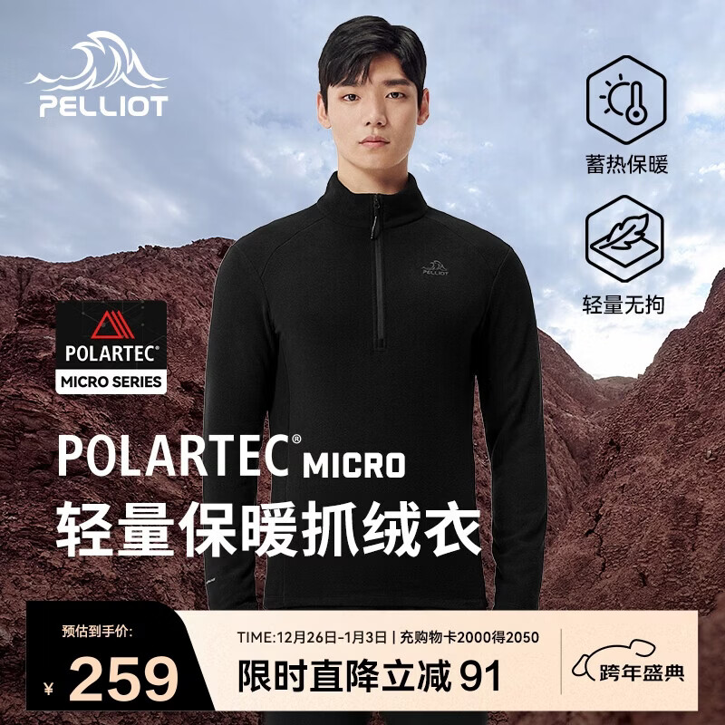 伯希和(Pelliot)[P系列]Polartec户外抓绒衣男加绒保暖冲锋衣内胆114310203黑L