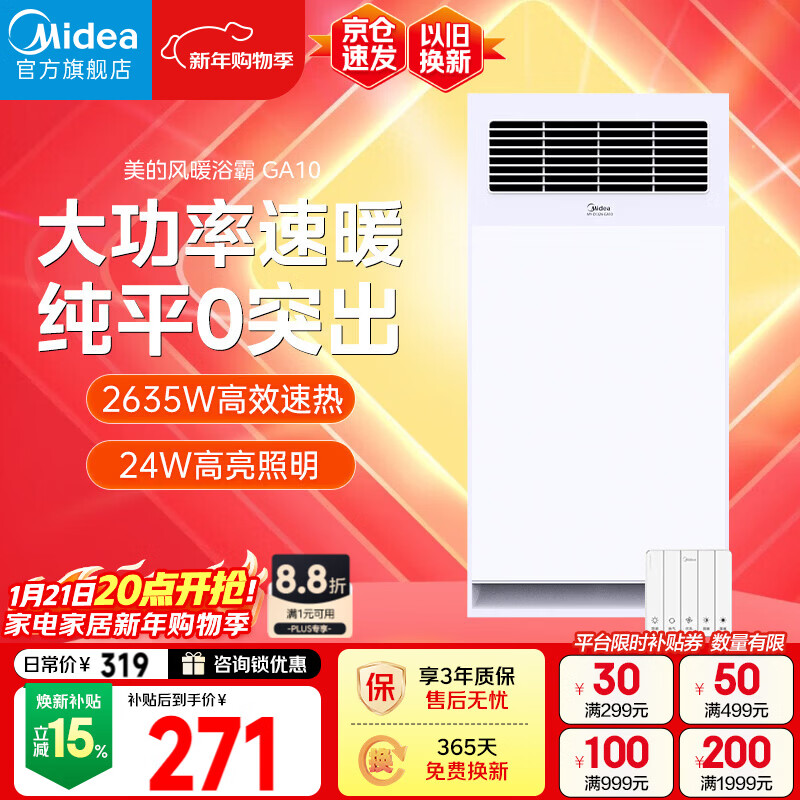 美的(Midea)风暖浴霸钢铁侠系列暖风照明排气一体强暖换气取暖GA10浴室卫生间