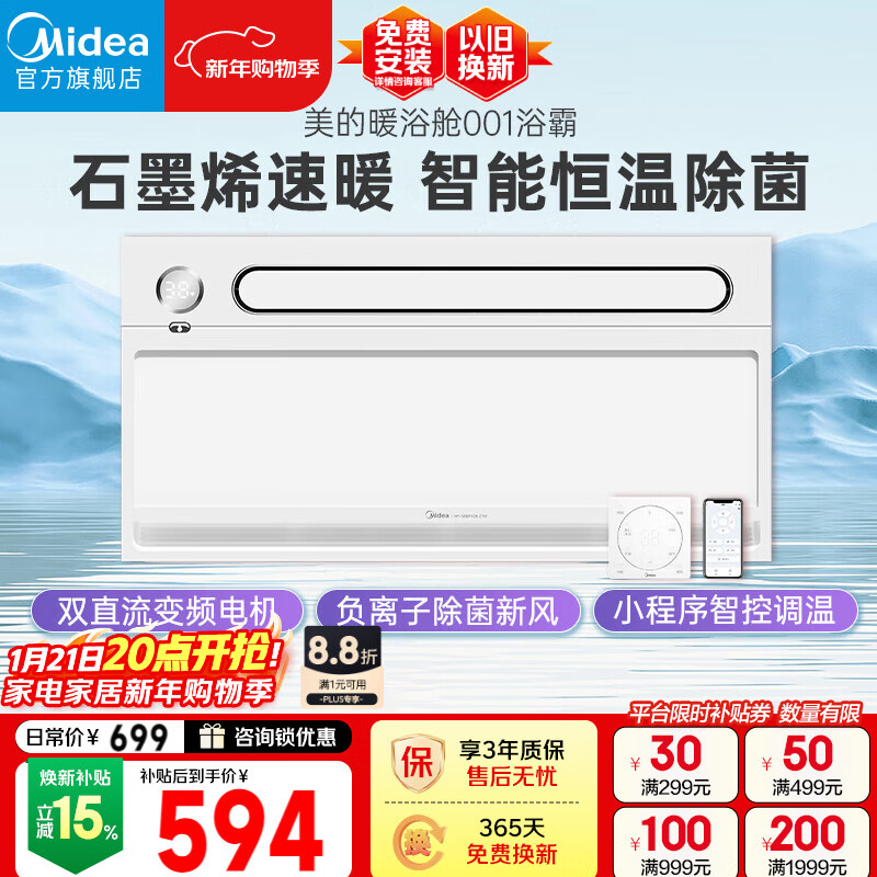 美的(Midea)风暖浴霸暖浴舱系列石墨烯速暖浴霸暖风照明排气一体摆风速暖001