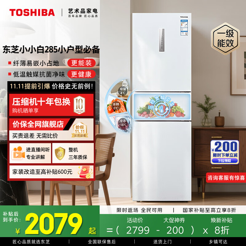 东芝(TOSHIBA)小小白285小户型大容量家用三门嵌电冰箱风冷无霜一级能效低温触媒抗菌国家补贴GR-RM285WI-PM153