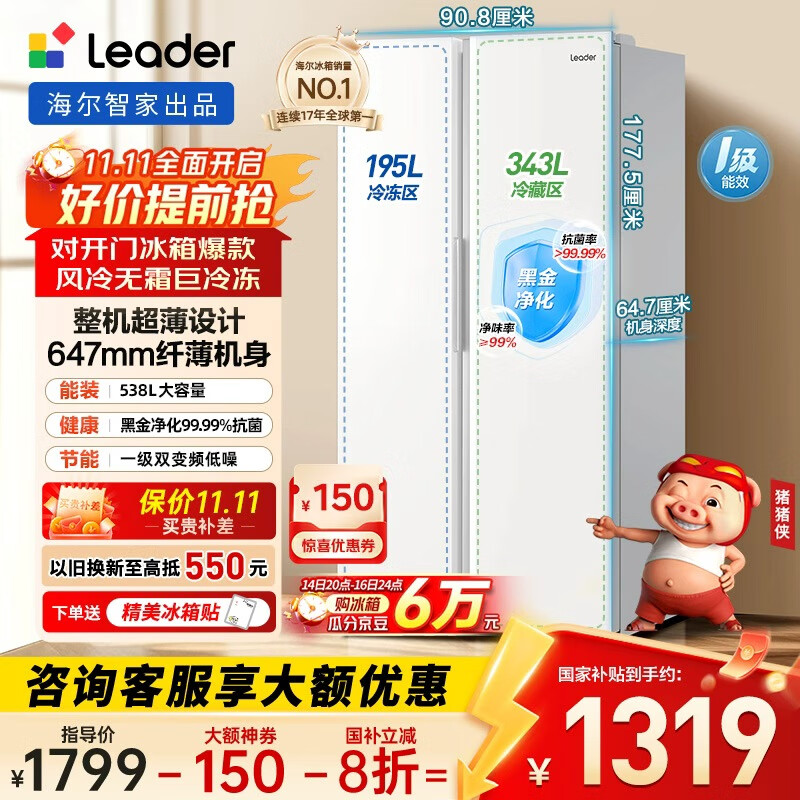 统帅(Leader)海尔冰箱出品 538L风冷无霜一级能效对开门双开门家用大容量超薄电冰箱LSS-560WL9【国家补贴20%】