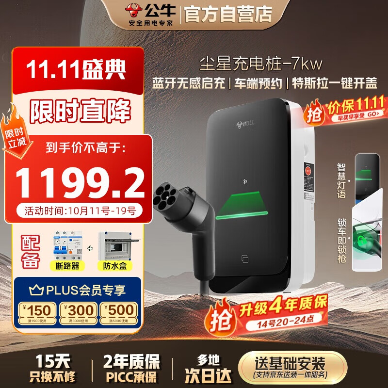 公牛充电桩家用新能源汽车交流适配于小米su7/yu7汽车特斯拉比亚迪问界蔚来 7KW尘星款 基础送装一体