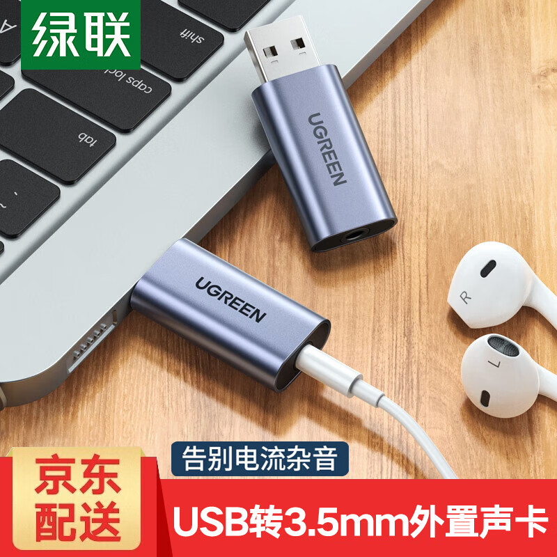 绿联 USB转3.5mm外置声卡 耳机麦克风二合一转换器线音频转接头 适用台式电脑笔记本PS4/5外接音响耳机 直插款【铝壳】80864