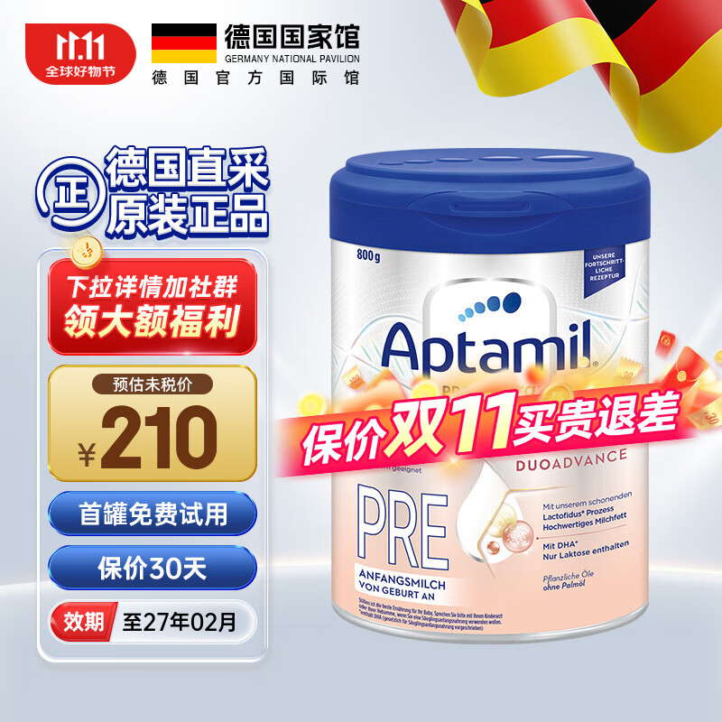 爱他美(Aptamil)德国白金版德爱白金HMO婴幼儿原装进口奶粉 800g/罐 【免费试用】德爱白金PRE段 800g