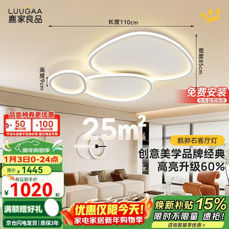 鹿家良品(LUUGAA)鹅卵石客厅吸顶灯现代简约全光谱护眼客厅大灯主灯led灯具包安装