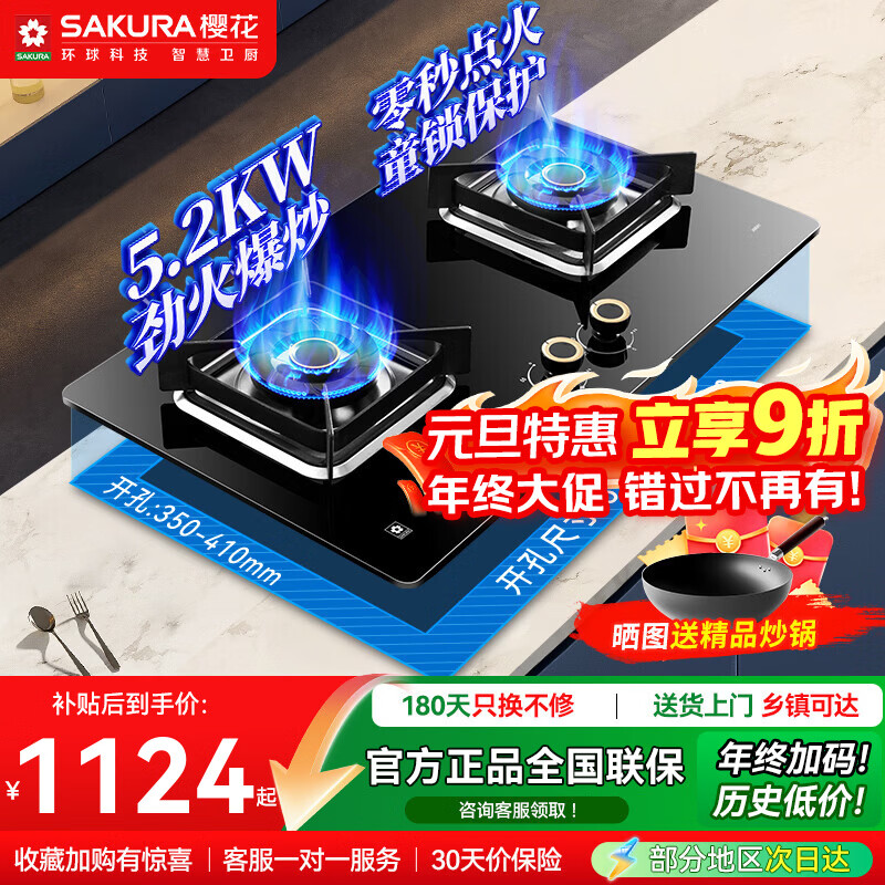 樱花(SAKURA)燃气灶天然气灶大火力液化气灶具家用双灶一级能效嵌入式台式零秒瞬时点火 JGE01【天然气】5.2KW猛火灶多开孔尺寸安装