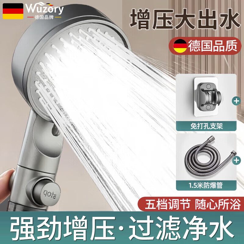 Wuzory【德国】增压花洒喷头淋浴超强大流量过滤洗澡家用止水莲蓬头套装 枪灰-增压过滤花洒三件套 五档调节丨过滤净水丨一键止水