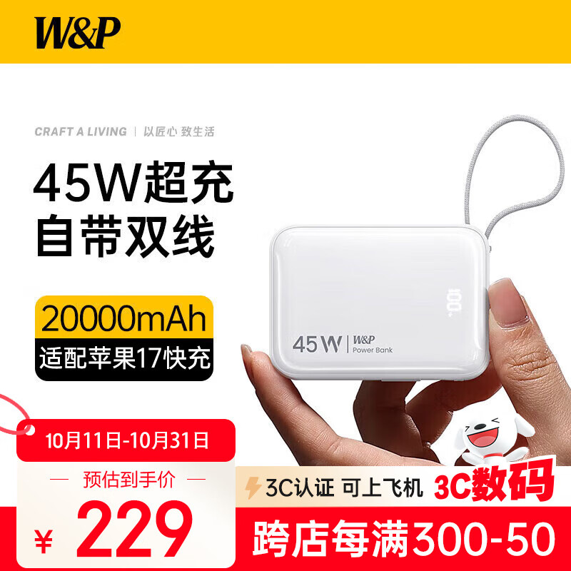 W&P 新国标3C认证可上飞机 45W充电宝20000毫安自带双线大容量快充移动电源小巧便携适用苹果17小米wp