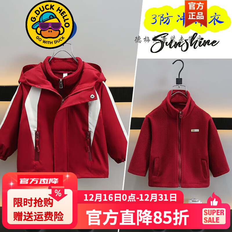 G.duck儿童冲锋衣三合一可拆卸男童秋装女童冲锋衣时髦帅气男孩户外外套 红色冲锋衣+摇粒绒内搭 130