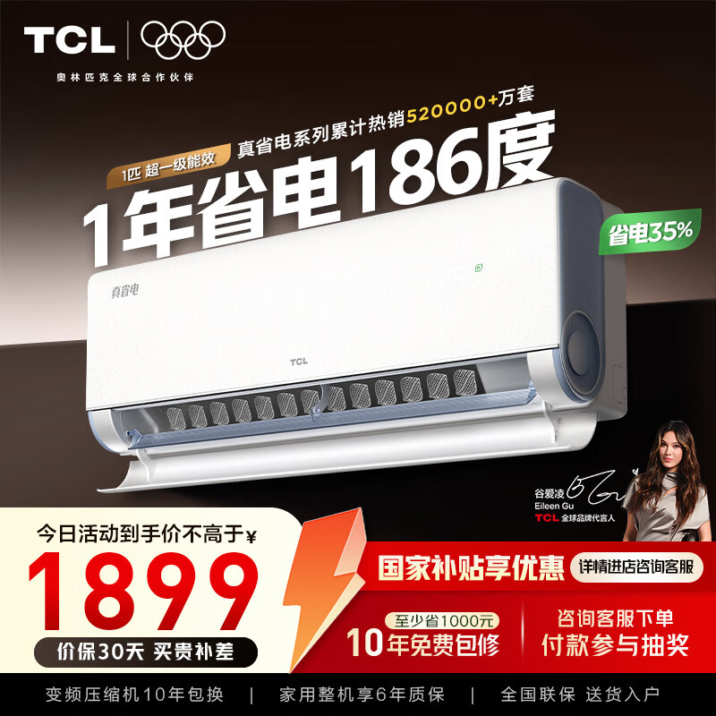 TCL大1/1.5匹 小蓝翼真省电空调挂机 超一级能效APF5.3省电35% 大风量变频冷暖 壁挂式卧室柔风挂机 大1匹 一级能效 真省电 省电35%
