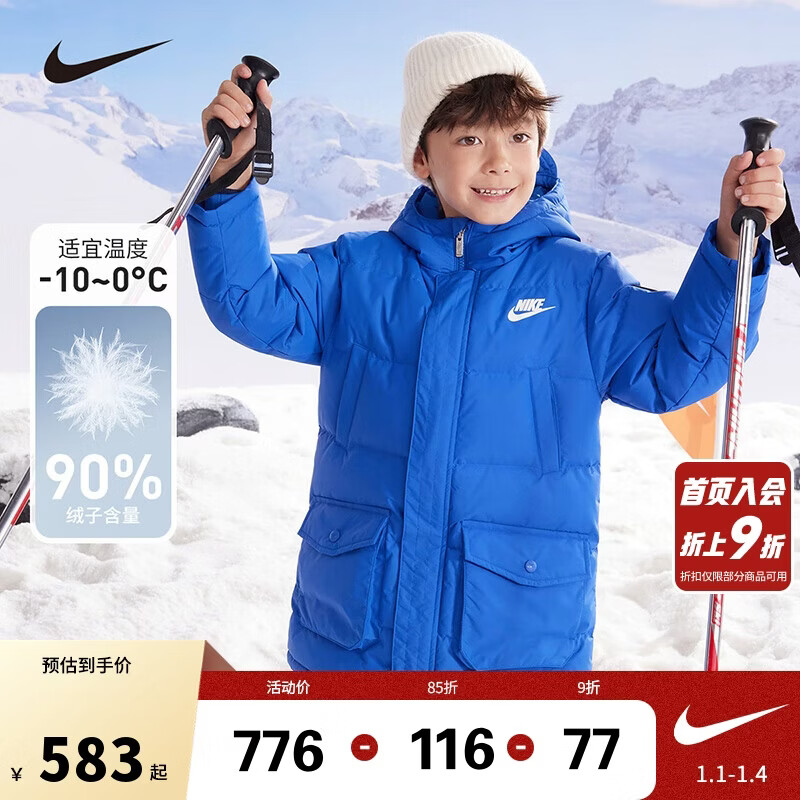 NIKE 耐克童装男女童中长款连帽羽绒服冬季新款轻盈保暖儿童外套