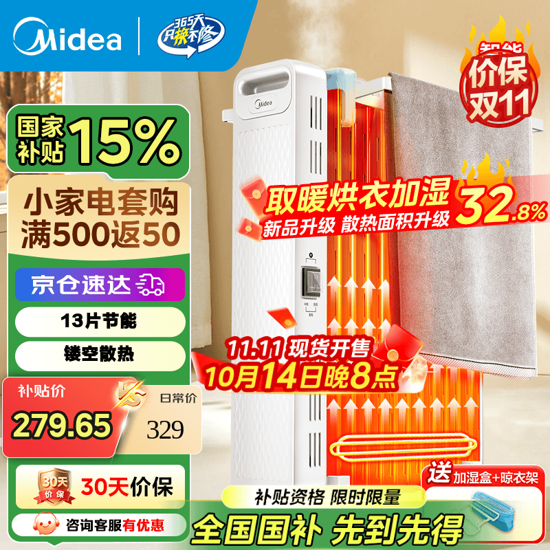 美的(Midea)取暖器电暖器片电油汀家用13片油汀防烫电暖气片大面积恒温加湿烘衣电热油汀 【热销款】13片散热机械式白色