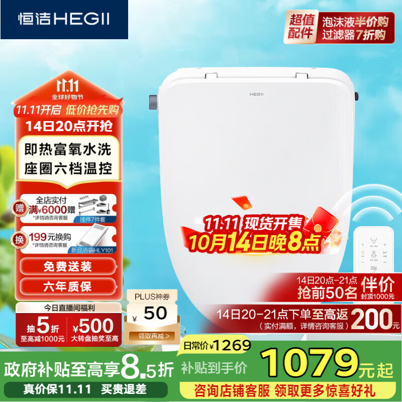 恒洁(HEGII)智能马桶盖HE937E 一键旋钮 即热烘干喷头自洁 遥控调温马桶盖板