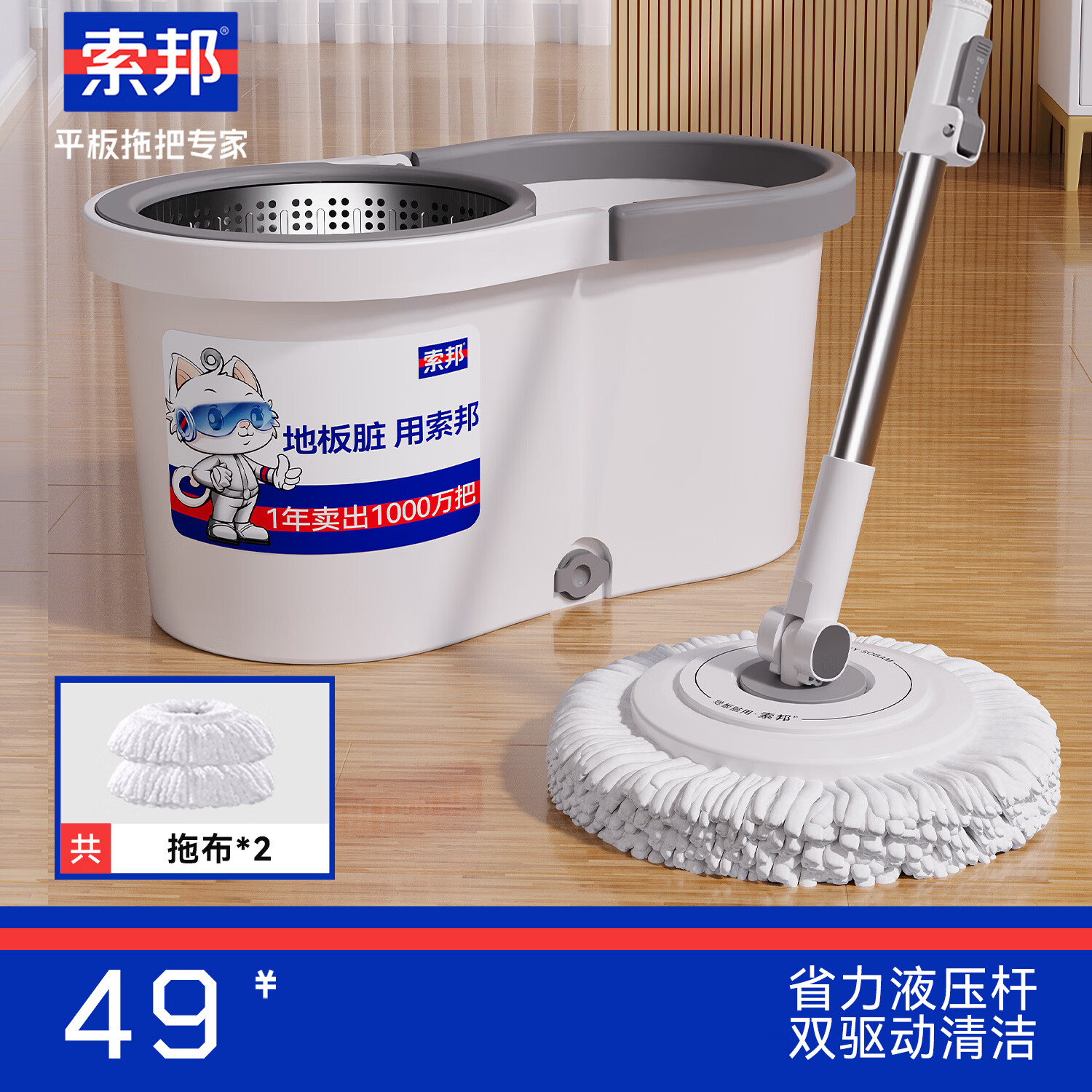 索邦旋转拖把34cm2头家用一拖净免手洗双驱动拖地拖布吸水墩布桶套装
