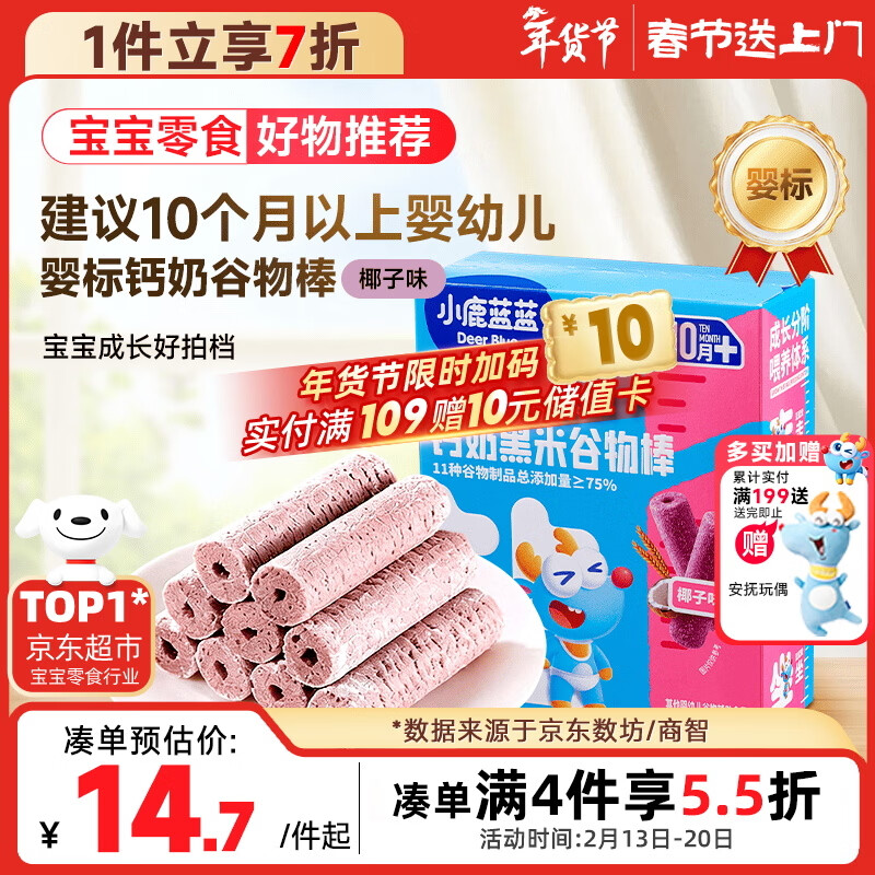 小鹿蓝蓝热门商品婴幼儿钙奶黑米谷物棒宝宝零食磨牙米饼泡芙饼干25g10月+