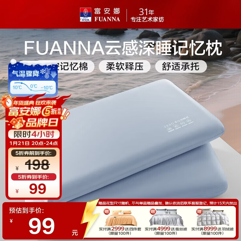 富安娜枕芯 慢回弹深睡记忆枕 人体工学释压护颈成人枕 中枕 70*42*8cm