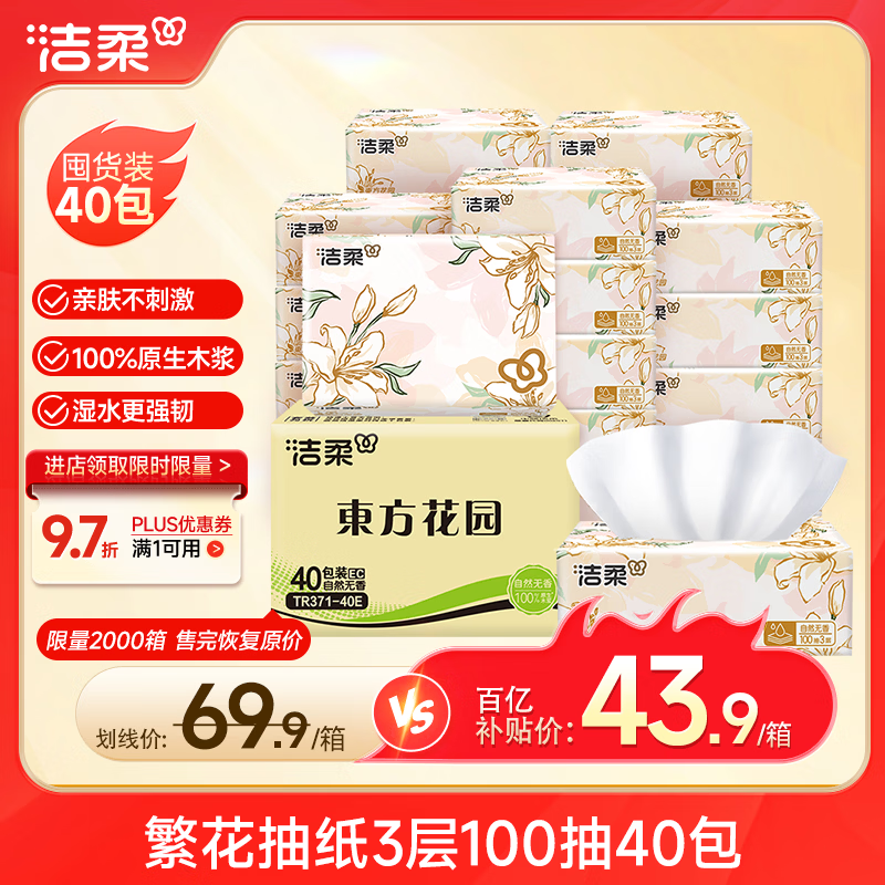 洁柔繁花抽纸 柔韧纸巾3层100抽*40包 可湿水面巾纸 纸巾卫生纸 整箱