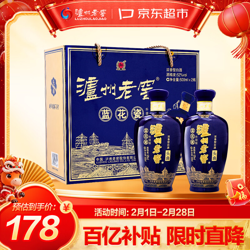 泸州老窖 蓝花瓷头曲 礼盒 浓香型白酒52度升级版500ml*2 年货节礼盒