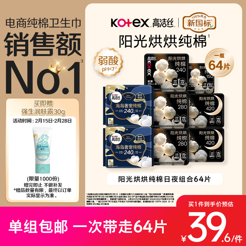 高洁丝【纯棉NO.1】阳光烘烘&海岛棉卫生巾8包64片日夜姨妈巾京东自营