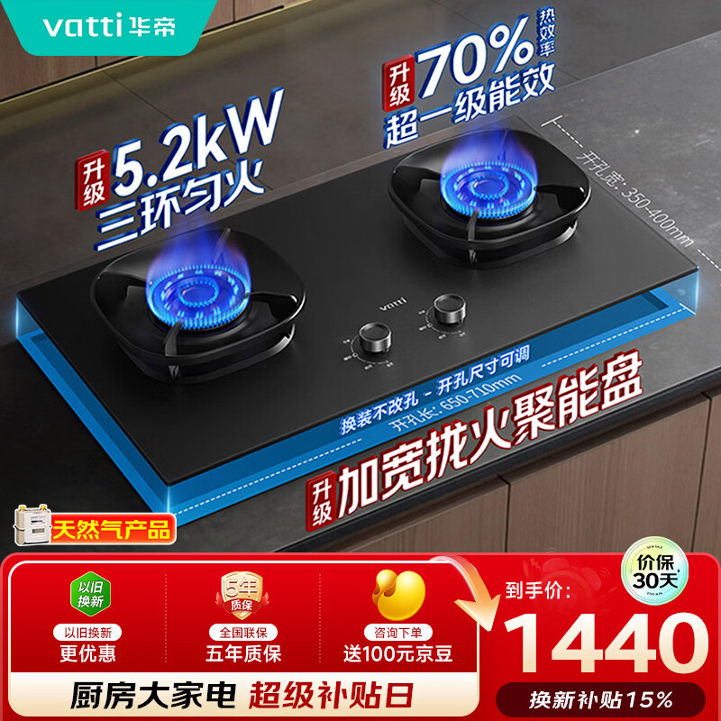 华帝【升级70%热效率】燃气灶天然气灶家用嵌入式5.2kW猛火灶以旧换新煤气灶双灶台燃气灶具i10308