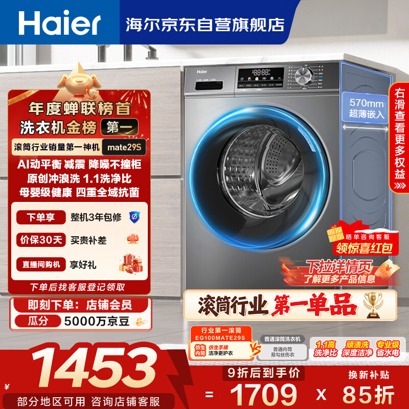 海尔(Haier)滚筒洗衣机全自动单洗家用 10公斤大容量超薄 家电国家补贴 京东自营29S 一级能效以旧换新 出租房