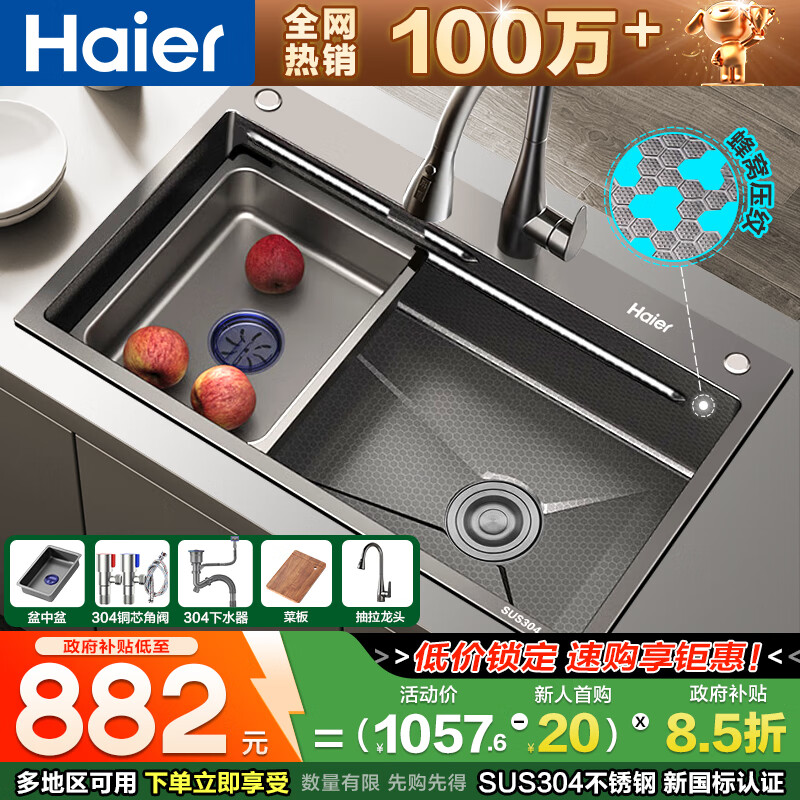 海尔水槽大单槽 洗菜盆一体盆单槽 厨房304不锈钢水槽纳米洗碗槽