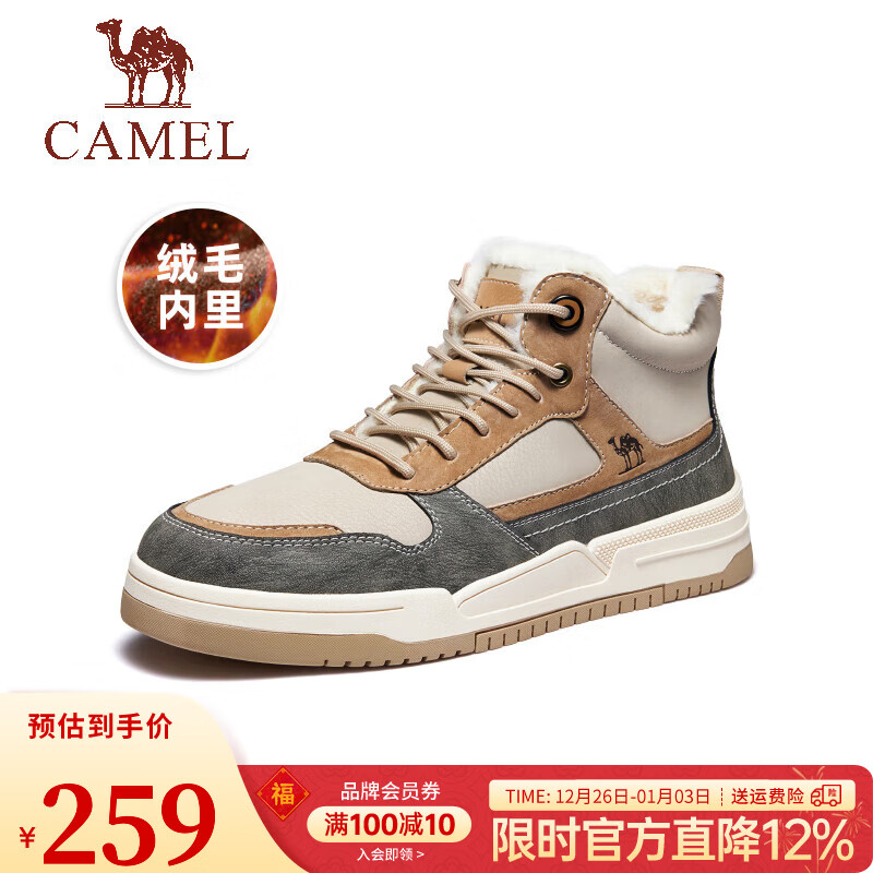 骆驼(CAMEL)官方店会员 秋冬季男鞋高帮板鞋子保暖加绒棉鞋会员 GE122W7691M 沙灰(绒毛) 42