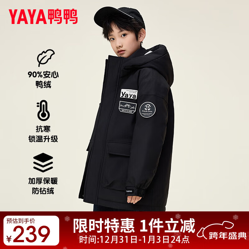 鸭鸭儿童羽绒服男童宽松百搭中长款学生冬季中大童装青少年外套GM 黑色 150
