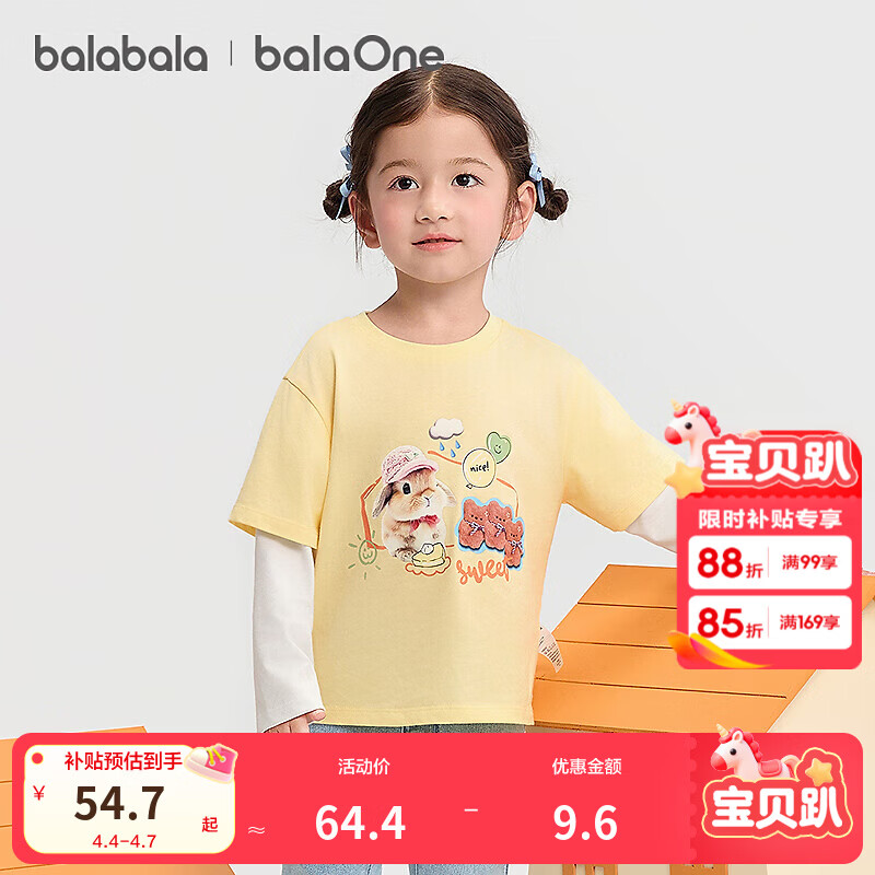 巴拉巴拉童装宝宝t恤纯棉假两件长袖上衣女童秋装印花萌 浅黄30006 110