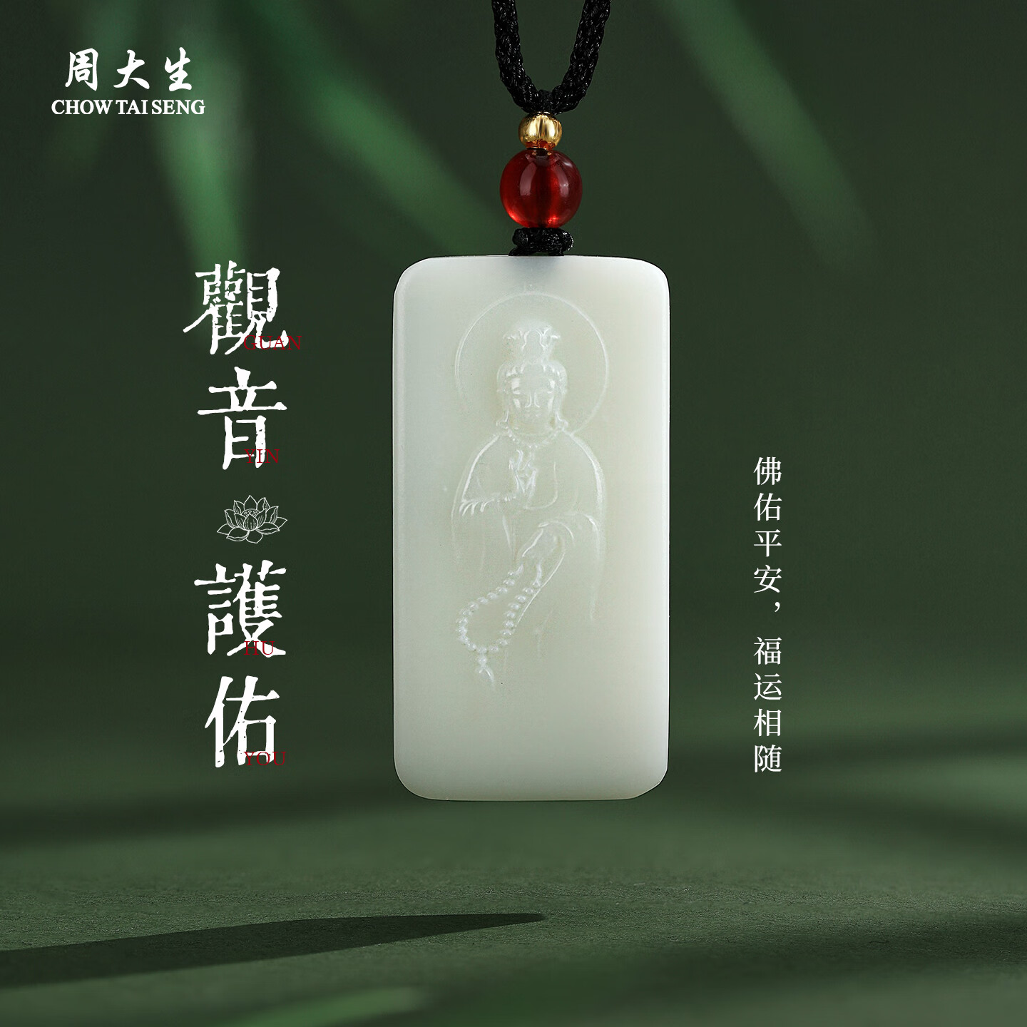 周大生和田玉平安无事牌观音菩萨佑福吊坠保佑送女友生日礼物 玉观音 40*20mm