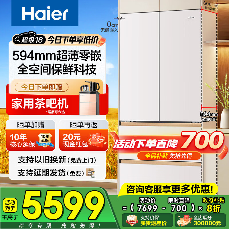 海尔(Haier)冰箱麦浪510升超薄零嵌入式60cm内法式多门四开门一级能效变频家用家电大容量全空间保鲜国家补贴 510L+594mm超薄零嵌+EPP超净+干湿分储