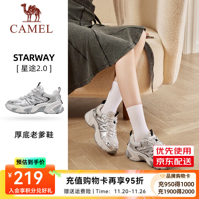 骆驼(CAMEL)星途2.0男鞋女鞋复古休闲厚底增高老爹运动鞋子 7038,银白/黑,女 38