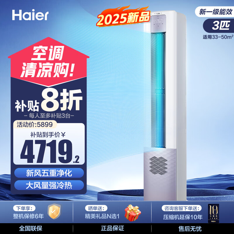海尔(Haier)【新品】3匹 雷神者 新风空调 客厅空调省电变频 空调柜机立式 大风量防直吹 独立除湿 以旧换新 3匹 一级能效 【新品】新风五重净化
